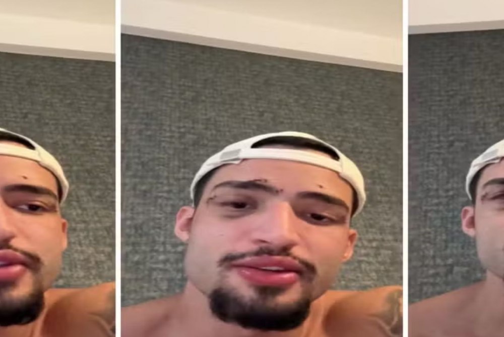 O rosto dele está machucado e com pontos, mas o influenciador não sabe as causas dos ferimentos.