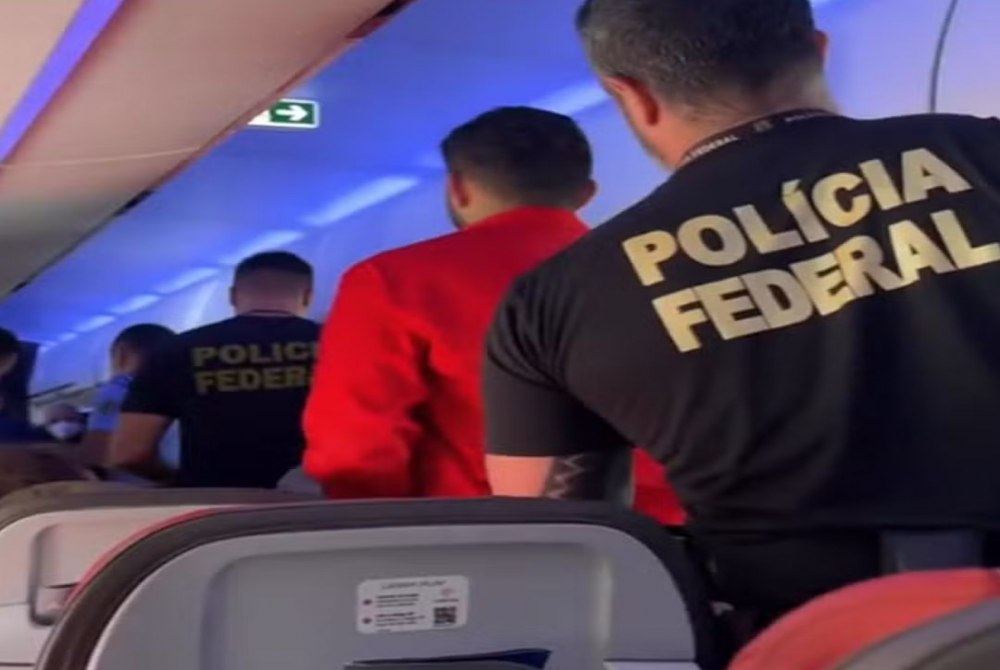 Em imagens de vídeo, publicadas nas redes sociais (veja o vídeo acima), é possível ver o momento que agentes da Polícia Federal entram na aeronave e pedem para o homem, identificado como Marco Antônio, acompanhá-los. Ele se levanta e é escoltado para fora.