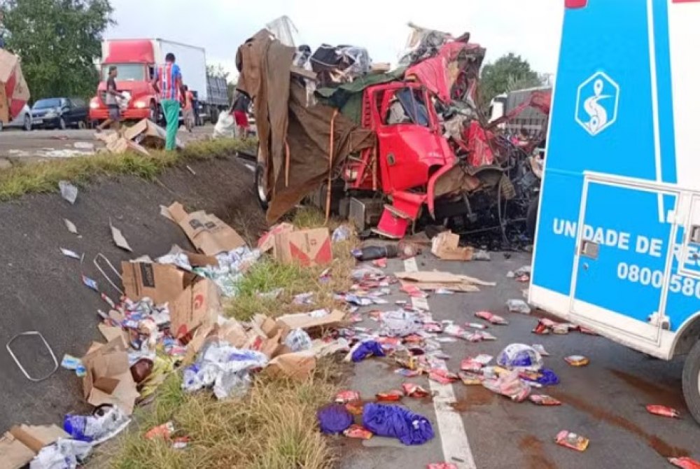 Conforme a PRF, os caminhões, que transportavam cargas de frutas e café, colidiram frontalmente. Imagens feitas por pessoas que passaram pelo local mostram que um dos veículos ficou completamente destruído.