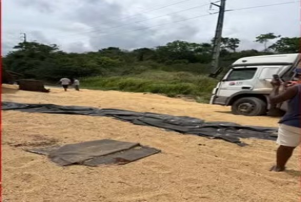 Imagens divulgadas nas redes sociais mostram que a carga de soja ficou espalhada na rodovia.