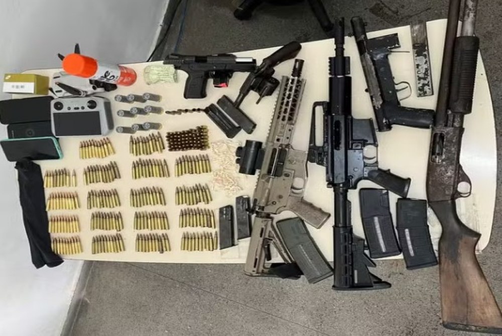 Com os suspeitos, foram apreendidos dois fuzis, sendo um deles equipado com magnificador (luneta) para disparos a longa distância, uma espingarda calibre 12, uma submetralhadora, uma pistola, um revólver, além de drogas, munições e um drone.